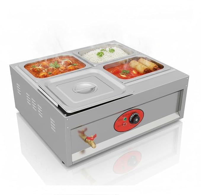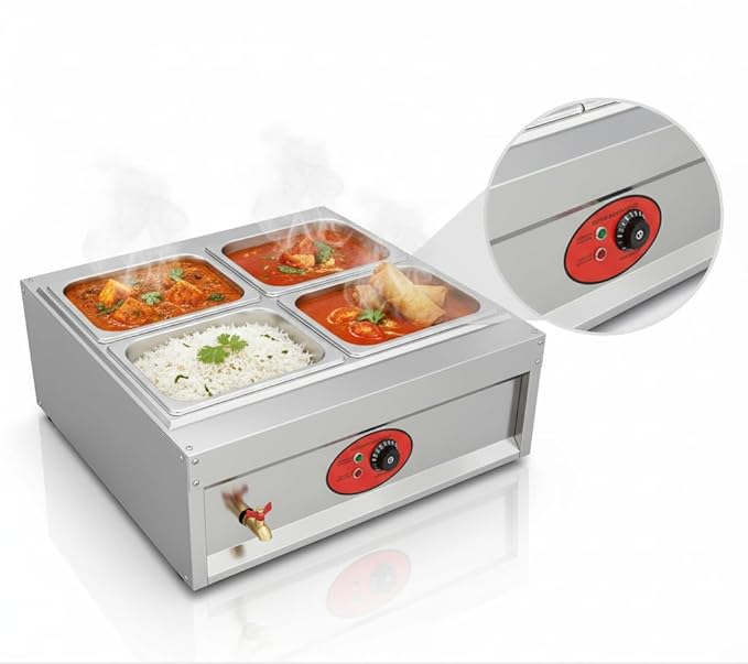 Crafted with a single-body stainless steel (SS) construction, the unit offers excellent corrosion resistance, easy cleaning, and long-lasting performance in demanding kitchen environments. Its powerful 2.5 kW electric heating element delivers fast and uniform heat distribution across all containers, ensuring reliable operation during peak service hours.