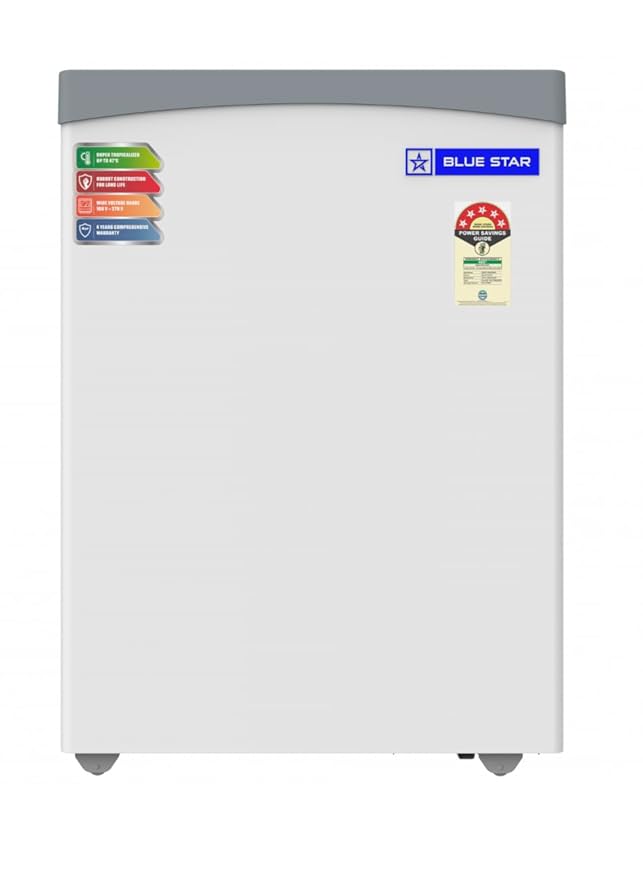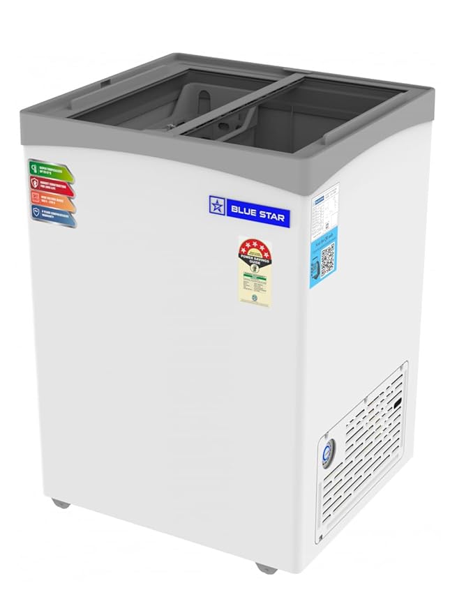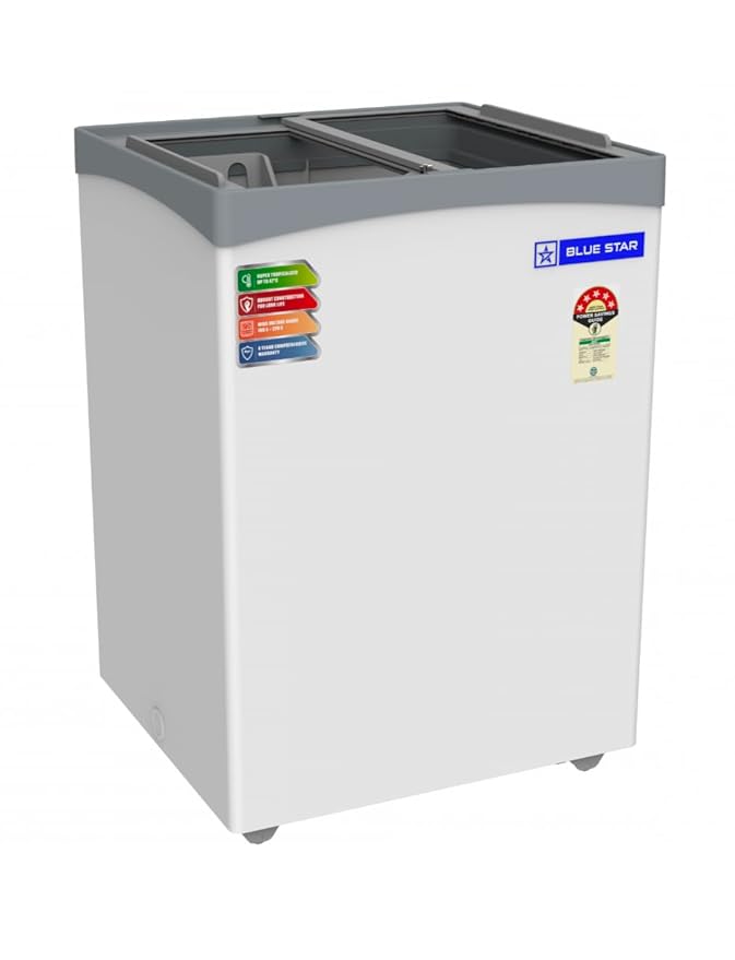 The Blue Star Glass 108 Litre Top Deep Freezer GT5-130NP is a 5-Star rated freezer. It has a gross capacity of 108 litres. The freezer operates efficiently with a temperature range of –13°C to –26°C. It uses a static cooling system with eco-friendly R600a refrigerant. The top-opening glass doors provide easy access. Castor wheels make it simple to move. A safety lock ensures secure storage. This freezer is ideal for homes, shops, and display counters. It offers compact design, energy efficiency, and reliable performance.