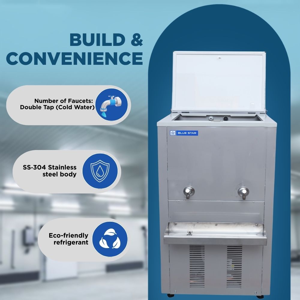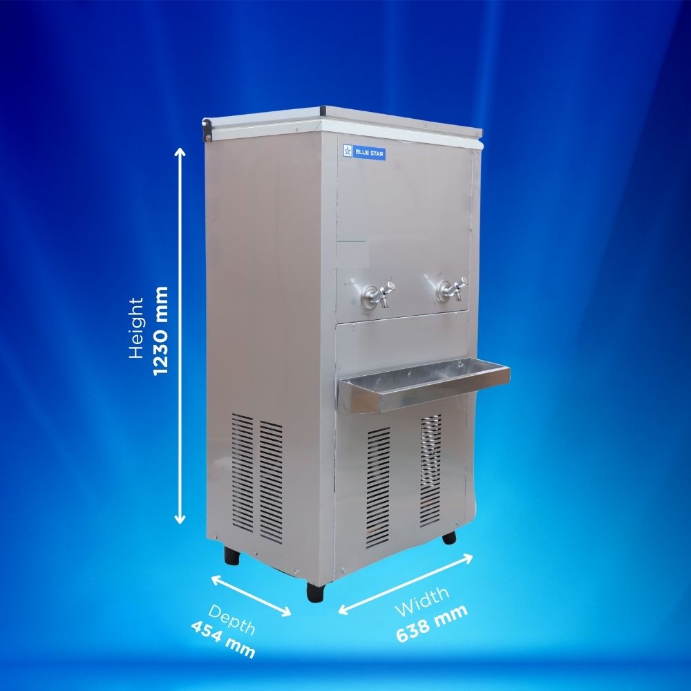 The Blue Star SWC3060SS is a 60-litre double tap stainless steel water cooler. It is ideal for offices, factories, educational institutions, and other high-traffic areas. This cooler delivers fast cooling of 30 litres per hour, ensuring cold water is available even during peak usage. The dual faucet design allows simultaneous dispensing for multiple users.