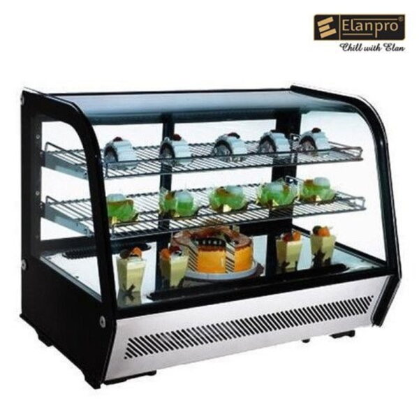 Elanpro Pastry Display Counter EHTC 160 is a stylish and efficient countertop showcase designed for bakeries, cafés, dessert parlours, and restaurant display setups. It comes with a Base + 2 Shelves configuration, offering ample room for cakes, pastries, muffins, and chilled desserts. The standout element of this model is its tempered curved glass front with a low-emissivity coating. This special coating improves visibility, reduces fogging, and enhances the overall presentation of your products. Your display remains clear and attractive throughout the day.