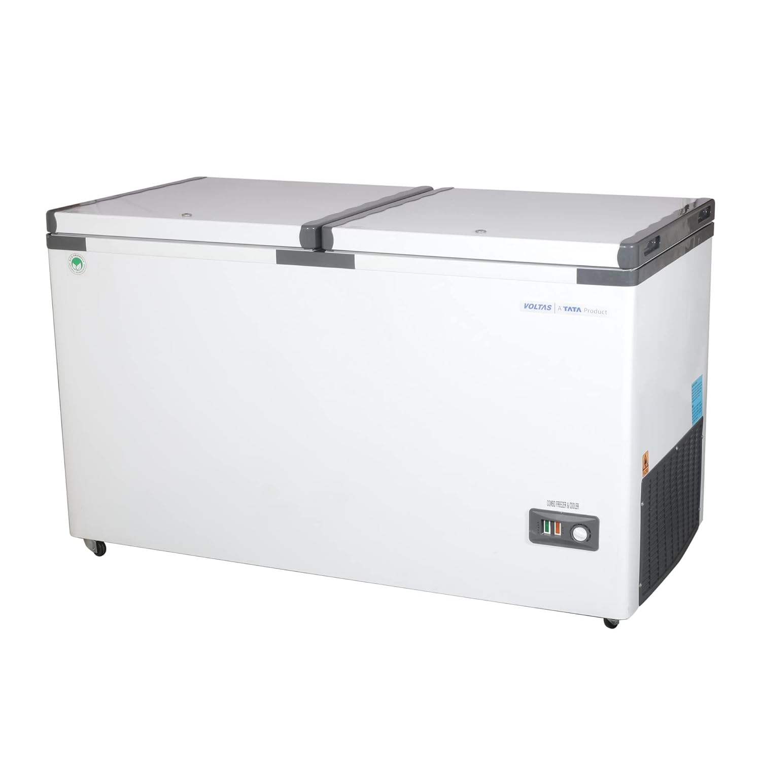 The Voltas Combo 400 is a double-door cooler cum freezer. It has a gross capacity of 400 litres. The freezer holds 200 litres. The cooler also holds 200 litres. The static cooling system keeps freezer temperatures below −18°C. It keeps cooler temperatures between 0°C and +7°C. The top-opening dual-door design makes it easy to access items. Castor wheels provide effortless mobility. The safety lock secures your contents. Ideal for homes, cafes, and small commercial setups. This combo cooler offers durability, energy efficiency, and reliable performance.