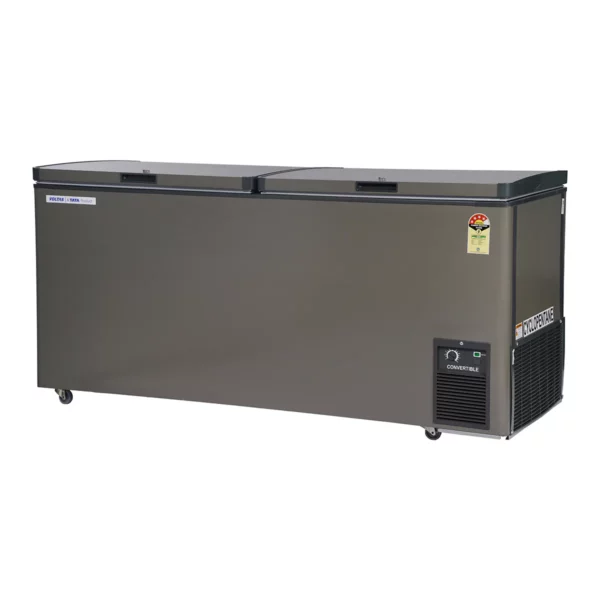 The Voltas CVF500DD-P deep freezer is a premium 500-litre convertible deep freezer that lets you switch between freezer mode (-18 °C) and cooler mode (0 °C to 7 °C), making it ideal for both commercial refrigeration and heavy-duty household freezing requirements. With its 4-star energy rating, static cooling technology, sturdy dual top-open doors, lockable lid, and smooth castor wheels, this high-capacity deep freezer blends reliability, flexibility and convenience. Backed by a 1-year comprehensive warranty and 3-year compressor warranty, the Voltas CVF500DD-P ensures peace of mind for bulk food storage, cold chain management, and frozen goods preservation across restaurants, shops and homes.