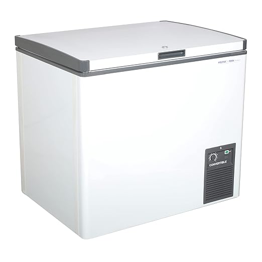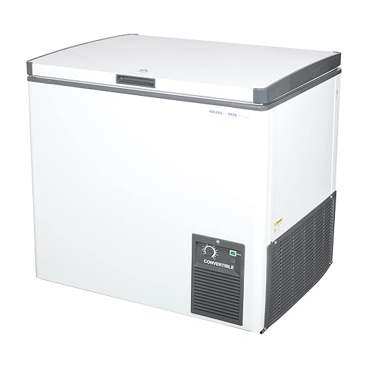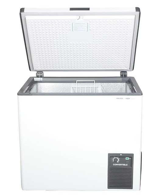 The Voltas CVF205SA2-P-AL is a convertible deep freezer with a gross capacity of 205 litres. You can use it as a freezer at below –18°C or as a cooler between 0°C and 7°C. This dual functionality makes it flexible for different storage needs. It has a 2-star energy rating and delivers efficient cooling performance. The single top-opening door allows easy access. The sturdy body and castor wheels make it durable and mobile. The freezer uses R600a refrigerant, which is eco-friendly. It includes a locking lid, a defrost drain, and a storage basket for added convenience. Voltas offers a 1-year comprehensive warranty with an extra 3-year warranty on the compressor. This deep freezer ensures performance, reliability, and peace of mind.
