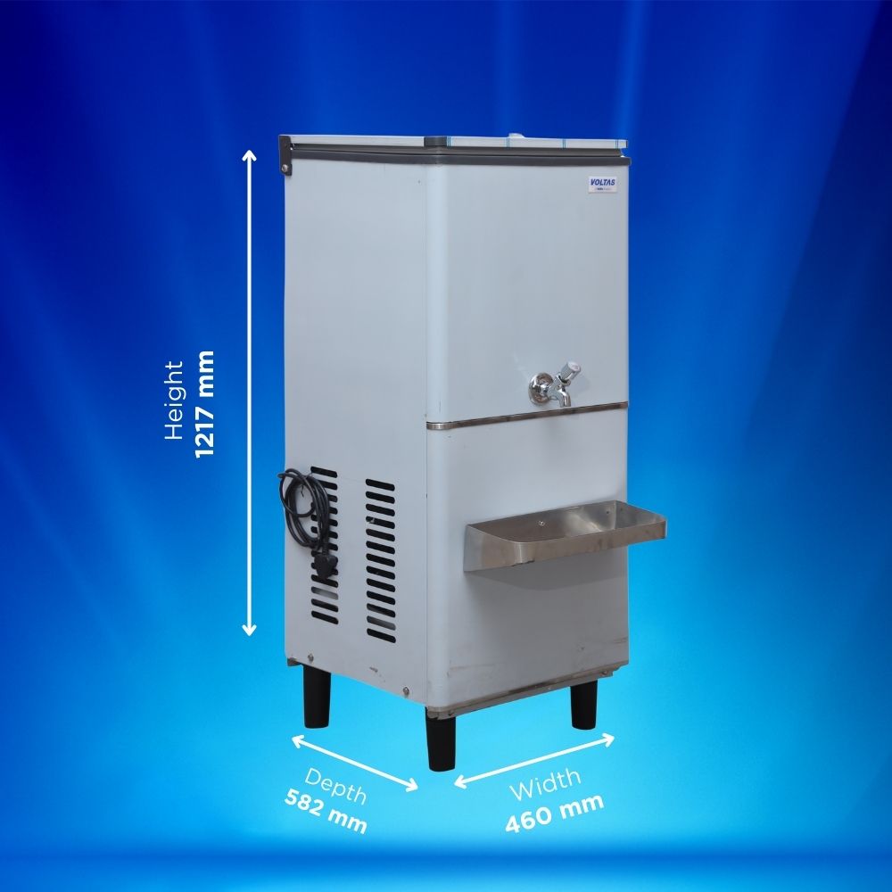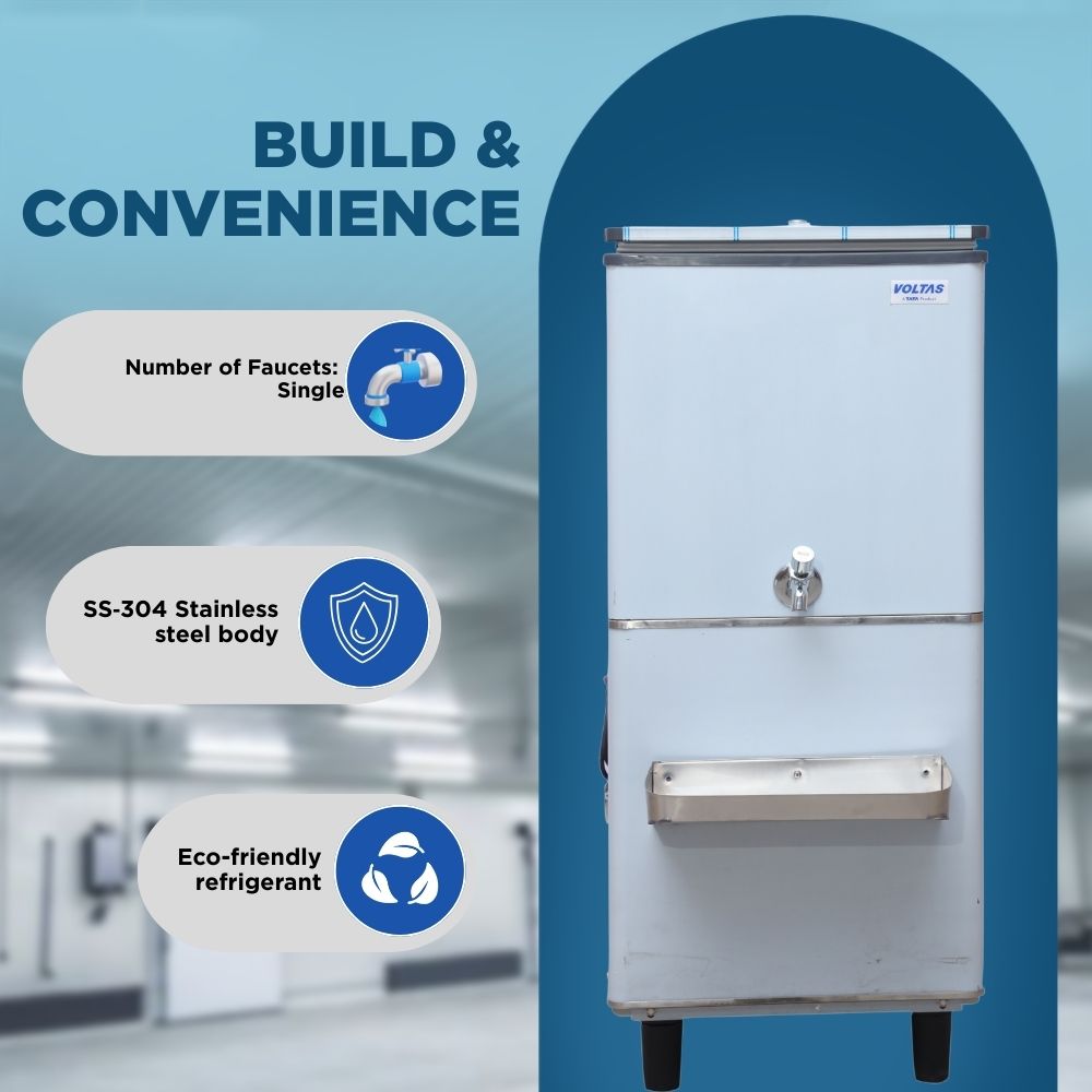 The Voltas FS1540 Single Tap Water Cooler is designed for high-volume cooling in offices, schools, events, and commercial spaces. It has a 40-litre storage capacity. The cooler can process 15 litres per hour. It serves 40–50 people and supports up to 100 glasses per hour.